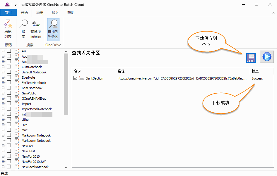 在选择本地存放文件夹后,OneNote Batch Cloud 将下载打勾的分区。