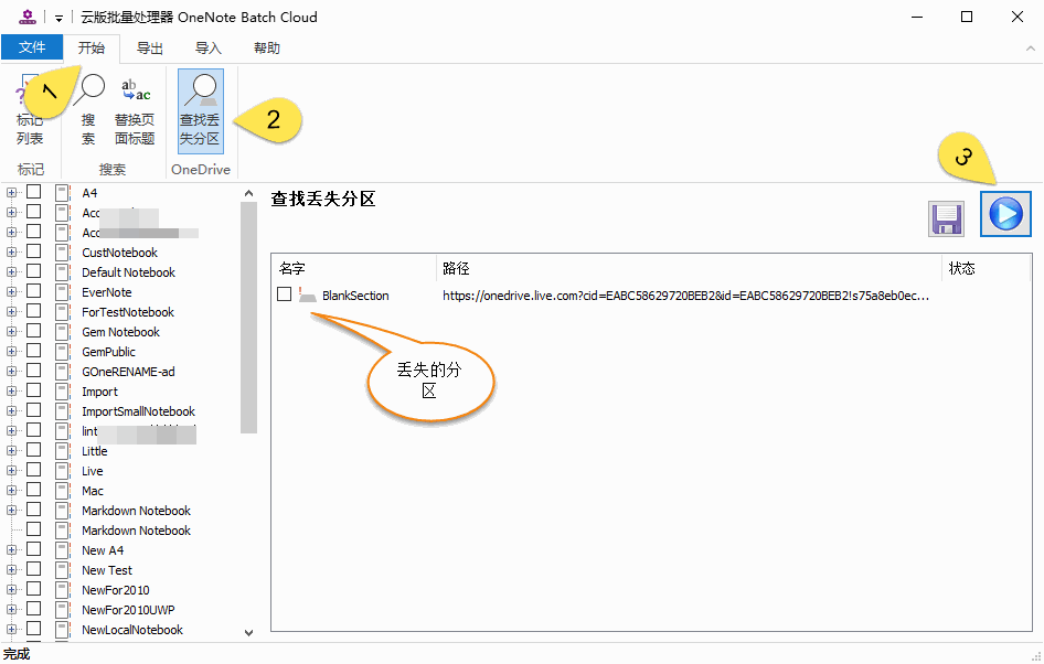 现在,Windows 云版批量处理器 OneNote Batch Cloud 提供一个功能,用于查找这类丢失的分区。