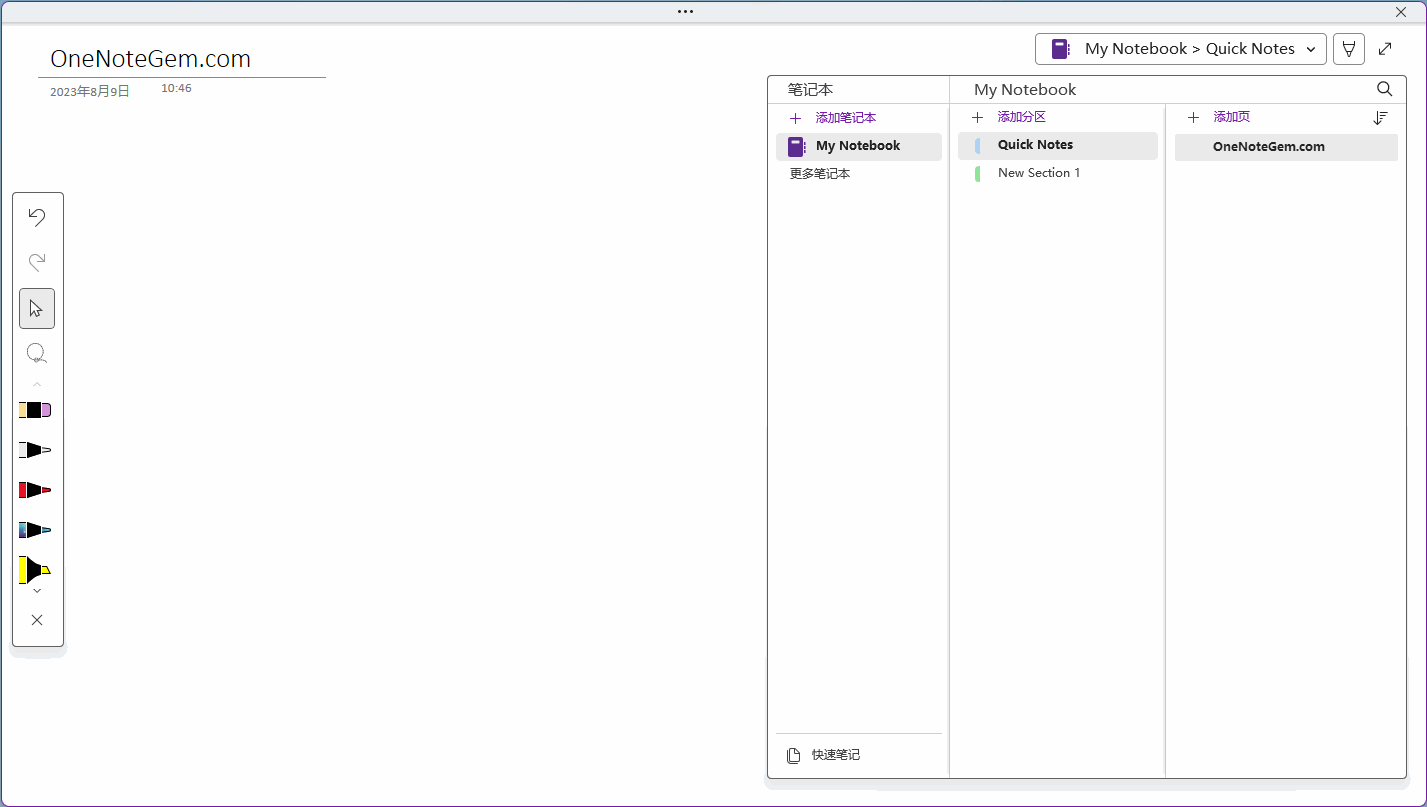 用鼠标按住笔工具栏,可以拖到 OneNote 窗口左侧,松开后,笔工具栏自动被安置到窗口的左侧。