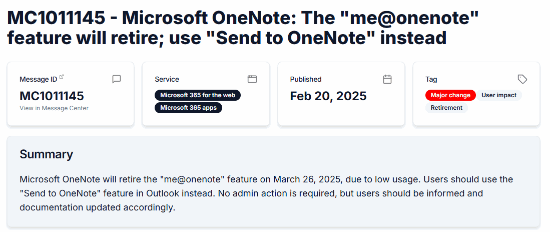 2025年2月20日微软 365 信息中心 MC1011145 档案里宣称 OneNote 的 "me@onenote.com" 功能将退役。