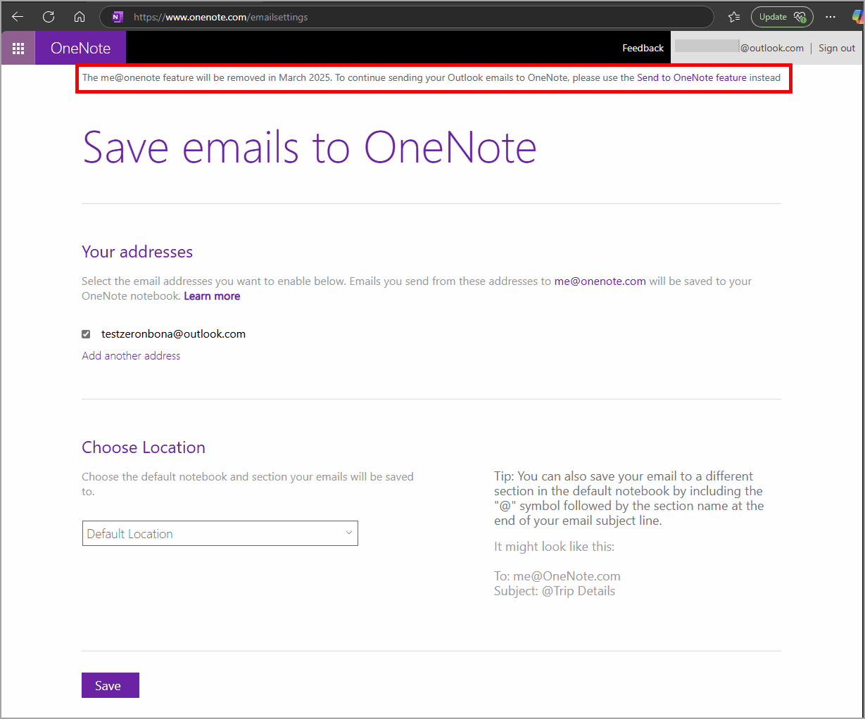 The me@onenote feature will be deprecated in March. To continue sending your Outlook emails to OneNote, please use the Send to OneNote feature:
