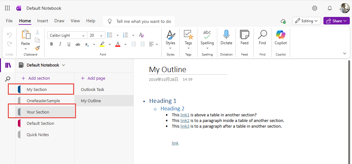 恢复成功后,OneDrive 会对新分区进行索引,等 3 分钟。用 Web OneNote 重新打开 Default Notebook 笔记本,既可发现 Default Notebook 里已多出 My Section 和 Your Section 两个分区。