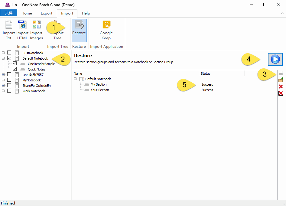 在 OneNote Batch Cloud 里:- 点击“导入”(Import) -》“恢复”(Restore)