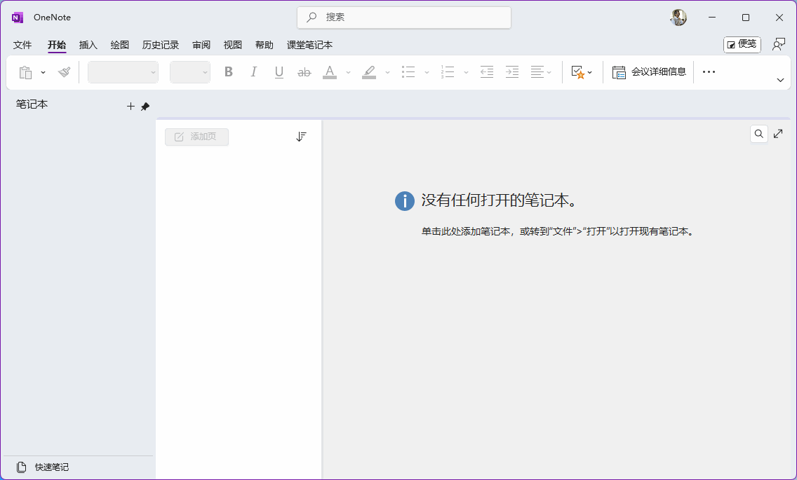 干净的 Office OneNote 会显示:没有任何打开的笔记本。