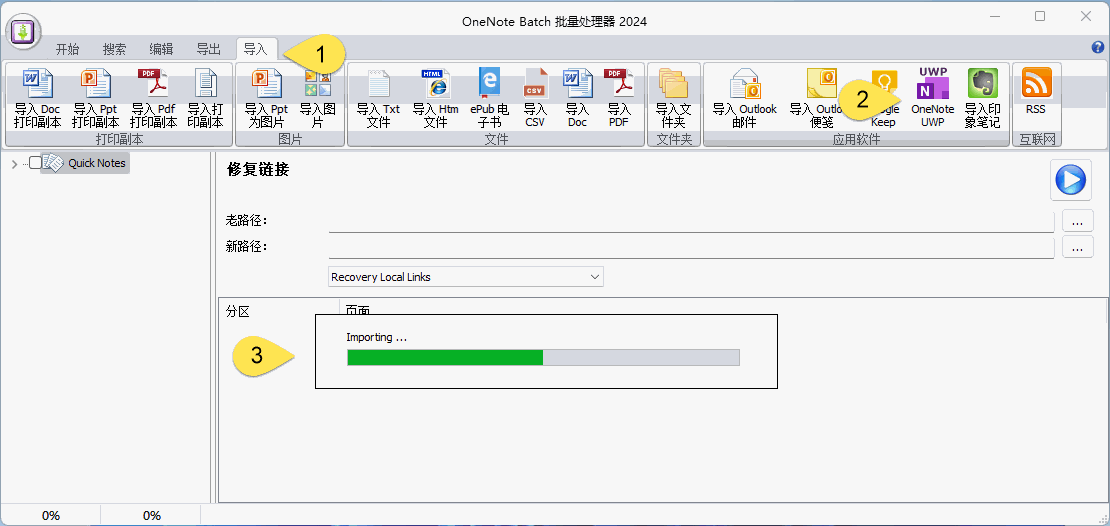 安装批量处理器 OneNote Batch 后,点击:- “导入”选项卡