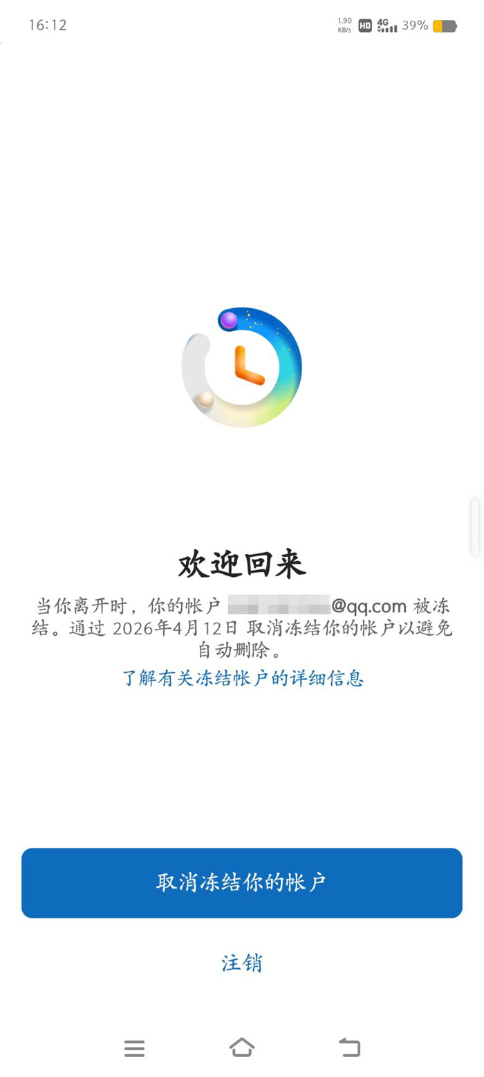 当你离开时,你的账户被冻结。通过 2026年4月12日 取消冻结你的账户以避免自动删除。