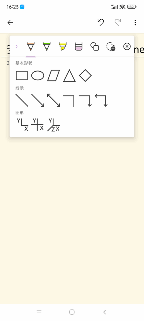 安卓 OneNote 现在提供了基本形状、线条、图形。基本形状有:长方形、椭圆形、梯形、三角形、菱形。